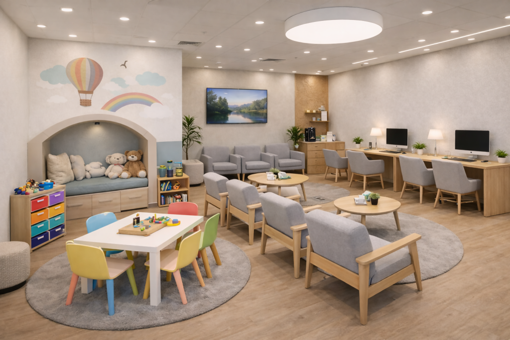 הוספת שולחנות העבודה ועמדות ההטענה מאפשרת להורים לנהל יום עבודה ולילדים ללמוד ולשחק גם תוך כדי קבלת הטיפול.